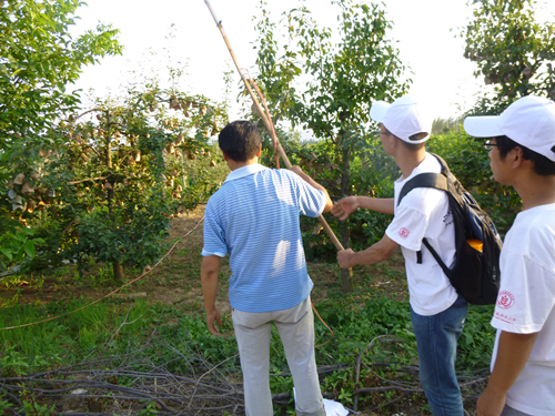 首先,队员们在试验站李老师的带领下来到了三合村,与当地的“土专家”进行了深入交流,就部分果农在生产过程中运用的相关技术方法做以了解。同时他们也对英国上市公司365试验站和当地农业局的大力支持表示感谢。之后,队员们来到了三合村村委会,与村支书进行了交流。他对政府通过减免农业税等的方式扶持果业发展的措施表示了肯定。另外,队员们了解到全村苹果种植户达一半以上,但由于越来越多的年轻人选择定居在外地,苹果种植主要由长者完成,因此村里的种植面积势必会减少,村支书对此深表担忧。最后,队员们来到了果园,当地果农给大家介绍了农药喷洒的操作方法与相关注意事项并教队员们喷洒农药。整个调研过程,队员们受益匪浅。