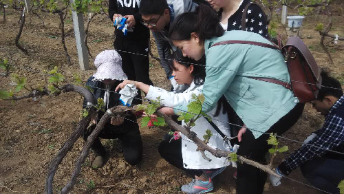 在参观的过程中,大婶用她丰富的农业生产经验告诉同学们如何去做农活和除去病虫害。大婶给大家传授完各种方法之后,同学们纷纷动手,开始剥树皮、除害虫、拔多余的葡萄叶还有锄地除杂草。女生主要负责剥树皮,而男生主要负责锄地和除杂草,,每个队员都非常认真地进行农田工作,女生们非常细致,将每一寸树皮都剥的干干净净以防有害虫寄生;男生也很卖力,不一会儿就浑身是汗,衣服上到处也满是泥土的痕迹。大家也进一步了解到了合作社工作人员日常工作的辛苦。