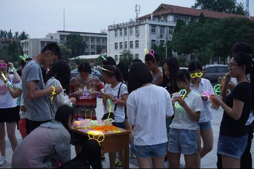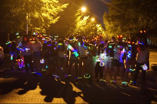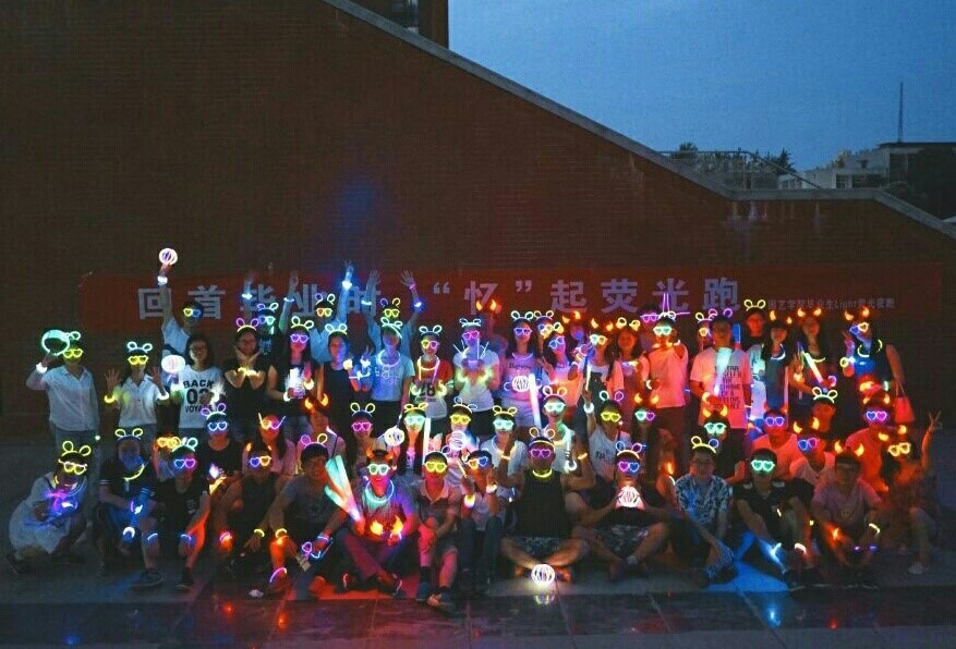 在两位老师的带领下,毕业生们热情高涨,荧光夜跑活动在欢呼声中拉开了帷幕,大家按自己的喜好用道具制作了属于自己的荧光饰品佩戴在身上,五彩颜色诠释着青春的绚烂。随着指令的发出,100余名参与者在一片欢声笑语中奔跑起来,他们头戴荧光牛角,手握荧光棒,身上挂满了各种荧光饰品,奔跑的人群在道路上形成了一道亮丽的风景线,把整个校园装点成了一个荧光闪耀的欢乐海洋。