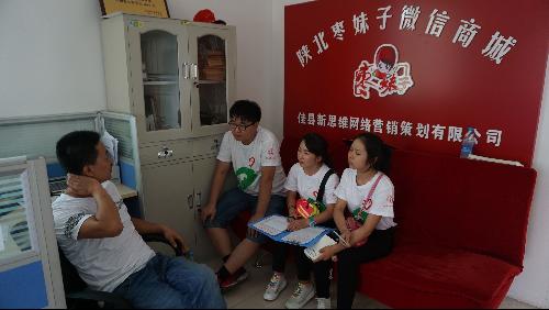 初来乍到的团队带着已掌握的一些资料和诸多疑问,伴着酷热的天气,徒步30分钟左右,来到了“陕北枣妹子微信商城”——一个由共青团佳县县委支持并实现互联网+模式尔生的实体微商店。热情的张经理将我们迎进来,并递上一杯热茶,温暖了四颗颠簸了18个小时的异域他乡的学子之心。经过一番深入的交流,从经理这里了解到佳县常年积雨淋灾,多年欠收,去年丰收却无路可销。红枣季节性现象较为明显,周期短,网络不健全,影响了红枣直销。除此之外,佳县本地劳动力弱,文化素质低,枣农销售意识低以及当地交通、运输闭塞同样对红枣销售有很大影响。为了避免滞销的现象的再次出现,当地居民及政府也采取了很多方法和措施,例如:外出本地人组建宣传队等。