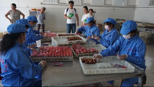 抵达加工厂后,公司法人代表常云的热情地接待了队员们,先带队员们参观了工作车间,并为大家具体讲解了红枣原材料加工的流程:验收分级,清洗,烘烤,去核,切片,加工过程红枣放置在0~10摄氏度的冷藏室用于保鲜,防腐烂,特级的红枣水分保持在23%下。其中负责人提到,他们与当地枣农签订了长期合作帮扶贫困村落,同时他们也时常与批发商进行联系与交流,了解市场信息,针对不同商户,制定不同等级的产品来打造红枣品牌。听到这里,队员们提到“枣想核你在一起”这个打造很成功的品牌,经理解释,他们正是借鉴把红枣和核桃结合起来的想法赋以吉祥的含义作为噱头,之后再应用于生产实践,市场结果证明小小的创新也是营销的一种方式。