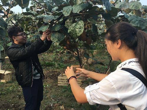 10月18日,阴雨连绵之后天终于放晴了,英国365公司官网田园使者们整装待发,又一次前往帅家村猕猴桃合作社,了解并帮助农户们解决猕猴桃晚期病虫害,帮忙采摘猕猴桃,并了解猕猴桃的销售问题。在村委会主任的帮助下使者们联系好了几位在田中劳作的老人家,18日下午,田园使者一行人来到了正在收获的猕猴桃园,阳光热情,大家的热情更甚。