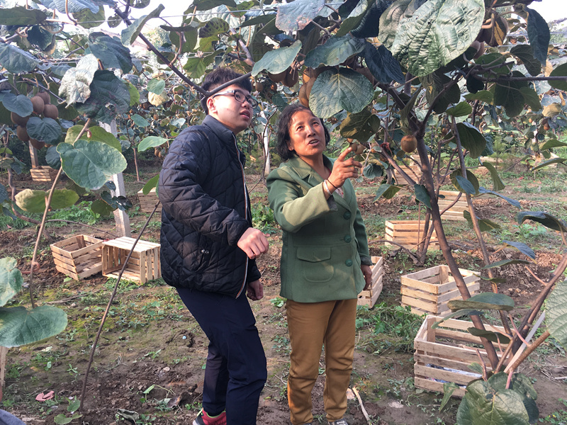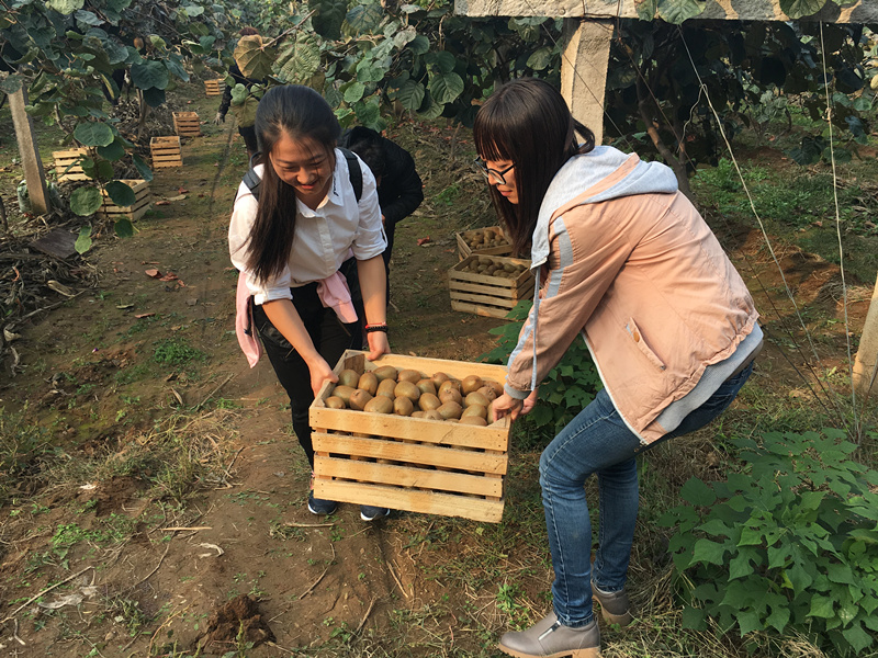 和煦的朝阳和徐徐的微风昭示着晴好的天气,显然这是一个适合干农活的日子。经过一个月的时间,猕猴桃树上已经结出了丰硕的果实,无疑这是丰收时节。这次使者们没有上门走访,而是直接去了田里。田地里,农户们正在进行进行猕猴桃的采摘工作,随后使者们与他们交流了一些关于果实摘取、储藏、运输、销售等方面的注意事项,提醒他们采摘轻摘轻放,避免挤压、碰伤;在成熟前8~10天进行采摘,以确保其硬度适合运输;将猕猴桃按优劣分类处理,分类销售可获得更多的利润等。讲解的过程中队员们悉心求教,侧耳倾听,收获颇多。