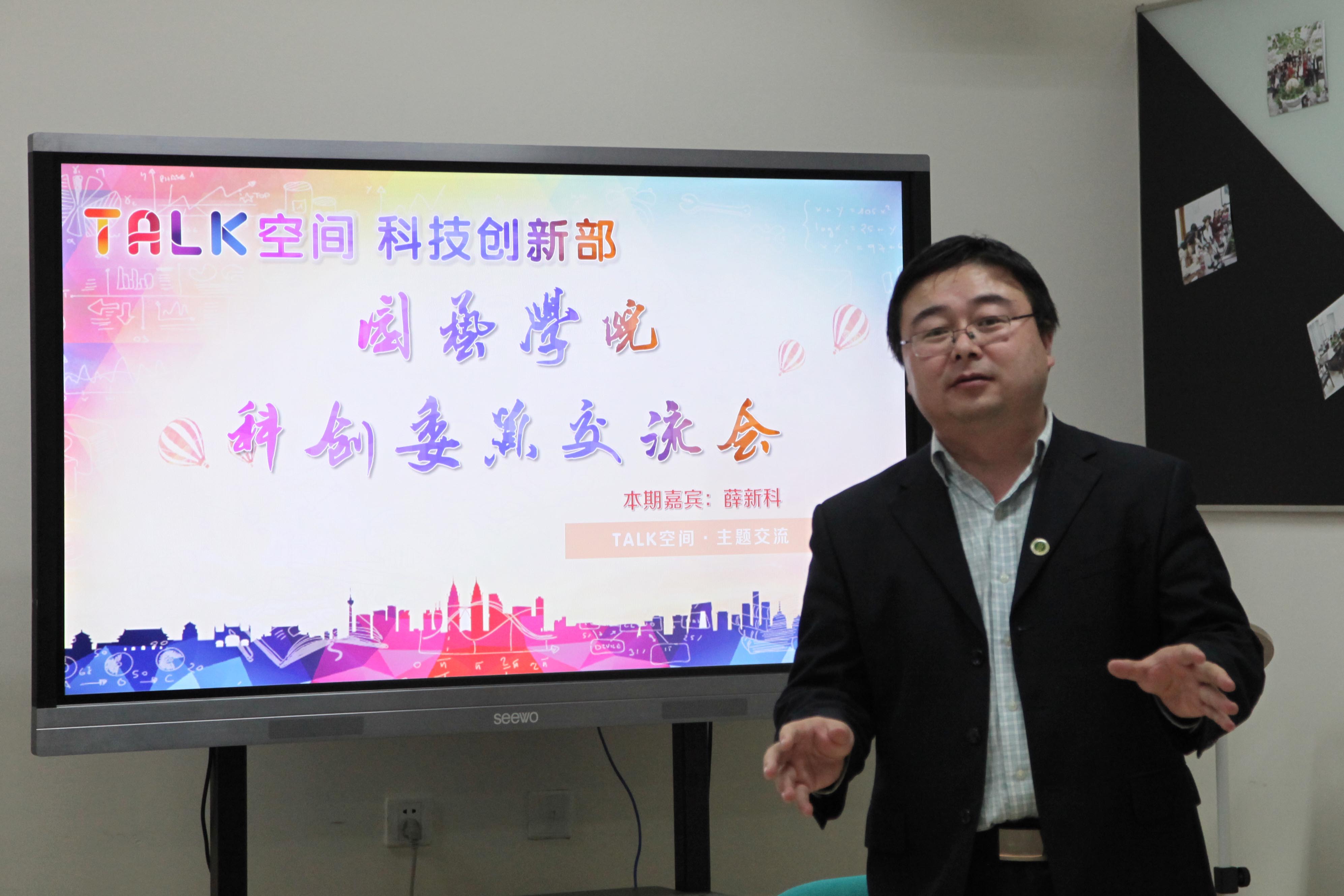交流会开始后薛老师引出时代潮流:“大众创新,万众创业。”并对此展开了详细的阐述,将当前的创新创业内涵深入浅出地介绍给在场的同学。其中,他强调创新不只是动不动脑筋的问题,更要看有没有胆量,有没有自信,纸上谈兵终究只是空谈,所以有创新创业的想法就要自自信地去付诸实践。