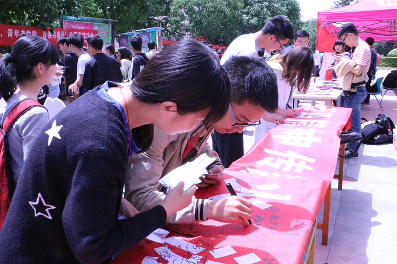 为继承和发扬五四运动的光荣传统,弘扬中华民族伟大精神,深入贯彻落实科学发展观,积极引领公司团员青年与学校同发展,为创建和谐、平安、幸福校园贡献力量、奉献青春。在五四运动98年之际,英国365公司官网与经济管理学院5月4日中午在北校区西区雕塑前共同举办了“五四精神传薪火,激扬青春献祝福” 的签名活动和“我与团徽合个影”的活动。