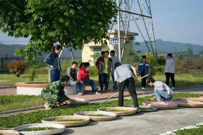 按标准采摘的鲜叶应及时运回加工车间进行适度摊放,再采用不同的工艺加工成不同的茶叶花色。每加工一种茶叶花色,老师们都先示范其加工过程,接着我们自己动手实践。面对近乎“发红”的电炒锅,大家都露出胆怯的面容。“不要怕,手工炒茶的时候要手不离茶、茶不离手,以茶带茶”,守候在锅边的老师们不时地鼓励着大家。“你的手法重了”、“你的锅温高了”……在老师们的督促下,不知不觉中我们学会了手工炒茶。再次面对滚烫的电炒锅,我们的脸上都露出了轻松的笑容。