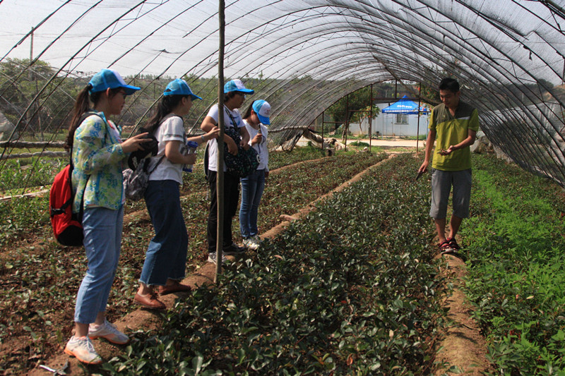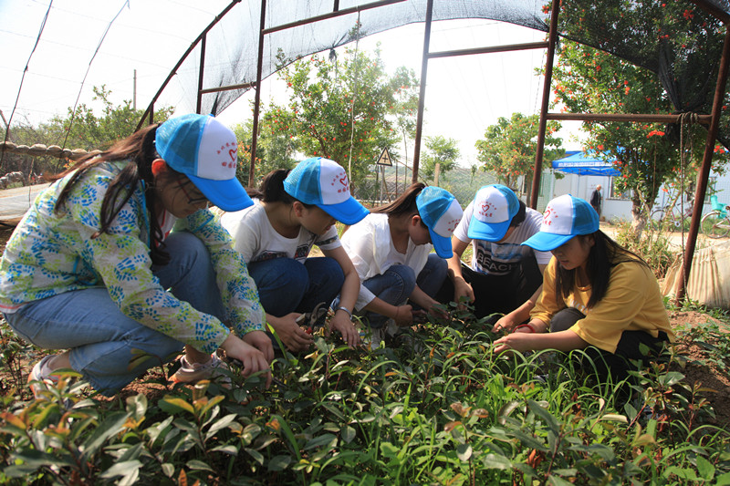 队员们在村民的带领下来到了种植石楠树苗的田间,在田间劳作的大婶对我们的到来表示了欢迎,并解释在石楠幼苗期间,需要进行修改顶芽,达到使之继续快速生长的目的。在植物学上也学到过:植物在生长发育过程中,顶芽和侧芽之间有着密切的关系。顶芽旺盛生长时,会抑制侧芽生长。如果由于某种原因顶芽停止生长,一些侧芽就会迅速生长。这种顶芽优先生长,抑制侧芽发育等现象叫做顶端优势。”纸上学来终觉浅,绝知此事要躬行,给大家传授完各种方法之后,大婶为大家找好了工具,同学们纷纷自己动手,每个队员都非常认真地进行农田工作,仔细的修剪顶芽,去除枯枝。炎炎夏日,不一会儿就浑身是汗,衣服上到处也满是泥土的痕迹。大家也进一步了解到了合作社工作人员日常工作的辛苦。