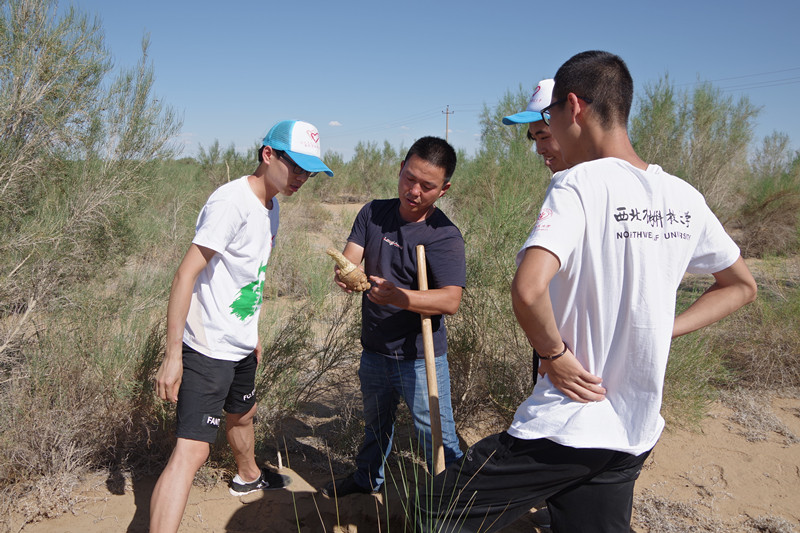 历时16个小时,调研队从西农到达位了于巴彦淖尔市磴口县的内蒙古王爷地苁蓉生物有限公司。刚到该公司,基地的王经理驱车带领全队参观5万亩的沙生药用植物栽培基地。一路上,队员们见到了锁阳、甘草、黄芪、射干、山药、苦豆子等沙生药用植物,这里瀚海无垠,银沙万里,成行成片的梭梭整齐屹立在狂沙中。队员们刚来到沙漠,都非常好奇,仔细观察着梭梭。队长李文观察到:基地梭梭林行距不同,疑惑这样的做法是为何。王经理似乎看出了大家的疑惑,讲解到:“曾经多采用两行一带式造林,宽行相距4米,窄行相距半米多。现在公司自主研发了肉苁蓉种子营养土直播机、种子营养块制作机、种子营养块穴播机等机器,为方便机械运作,多采用等距造林,行距5米,株距30公分。”通过此行,调研队对肉苁蓉这种全寄生植物,以及梭梭和苁蓉的寄生关系有了更深的理解,并体会到了生命的可畏,治沙之艰辛。见证了以沙治沙,致富治沙两不误的沙产业给沙区带来的巨大变化。大家都立志要以己所学,响应一带一路号召,为沙产业发展贡献自己的绵薄之力。