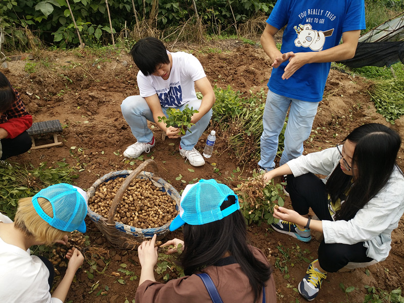 在村口,李金让叔叔等待着队伍并将队伍带领到田地。这时期,田地里的村民正在收获花生。看着村民们辛勤劳作,田园使者们也相继加入了收获花生的队伍。村民大叔熟练地将花生刨出,使者们抖落上面的泥土,将成熟完好的花生摘下放进竹篮里,摘剩的部分整齐地堆放在一起。经过了劳动,有些人已经有些疲惫,李叔周到地送来了矿泉水。大家有说有笑,气氛十分和谐。有的使者想起小时候的一篇课文《落花生》,问起村民们。村民大妈回答:“花落到地上,就不怕了,花生就会长出来的。”做完了摘花生的工作,大家都有些饿了。使者们告别李叔和村民们,坐上了回程的公交车。