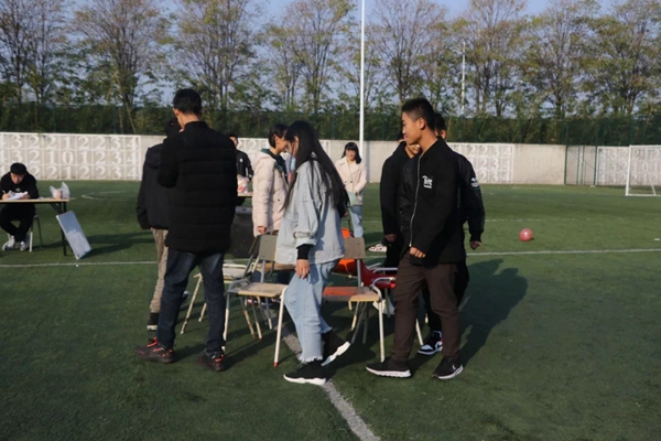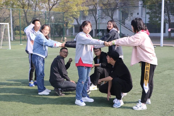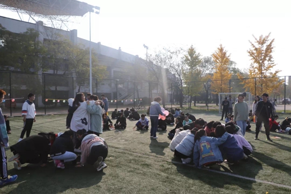 悦耳的轻音乐,彩色的气球营造出轻松愉悦的氛围。游戏在轻松融洽的氛围中拉开序幕,第一个小游戏考验大家的团结凝聚力,要求十个人站在一张报纸上,坚持最久为获胜者。每人一只脚在报纸上,一只脚悬在半空中,团队成员肩并肩,手拉手,使得原本松散的阵型变得稳定而坚固。“松鼠与树洞”的游戏中,同学们争相参与,场上气氛十分活跃。通过搭建“树洞”的肢体接触,打破同学们之间的隔阂,让同学们可以在短时间内增进对同伴的认识,尽早地融入活动,融入集体。“对歌”游戏,既考验的同学们反应力,也体现了班级内部同学的默契。你一句我一句,欢快的歌声中洋溢着幸福的音调。上午的暖阳洒满了小足球场,而让这里更加充满热情和暖意的,是同学们积极参与各项趣味活动的身影和回荡于足球场上空的阵阵欢声笑语。