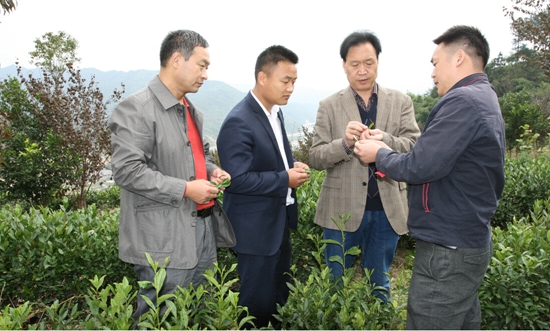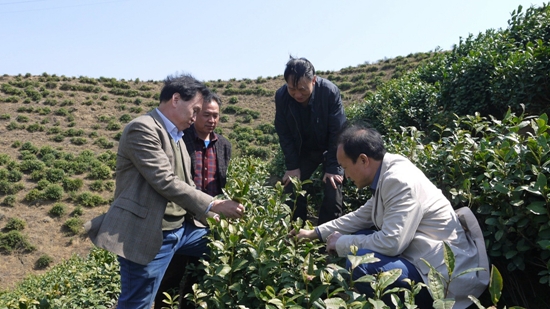 肖斌教授为商南县指导茶园管理,商洛市农业局邵宝成副局长、商南县茶叶局局长和企业主认真听取并详细询问