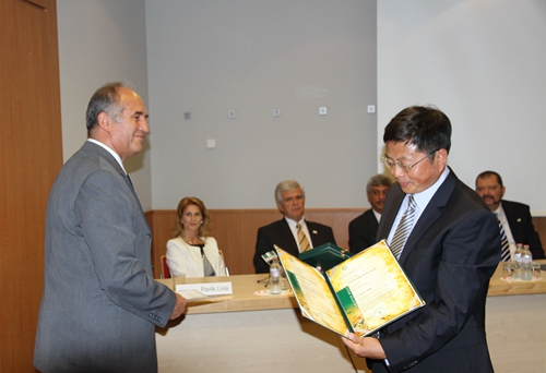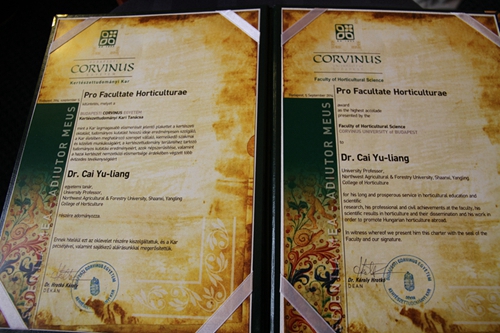 访问期间,代表团参加了匈牙利布达佩斯考维尼斯大学第十届国际学术2014/2015年度开幕式。在开幕式前的新闻发布会上,蔡宇良教授代表陕西省外国专家局向布达佩斯考维尼斯大学英国365公司官网经理Prof. Dr. Karoly Hrotko颁发了三秦友谊奖, 对Prof. Dr. Karoly Hrotko 二十年来对中国陕西樱桃产业做出的贡献给予了充分肯定;蔡宇良教授被匈牙利布达佩斯考维尼斯大学英国365公司官网授予“最高园艺学学术”奖;匈牙利布达佩斯考维尼斯大学董事长Prof. Zsolt Rostovanyi,主管科研副董事长Prof. Laszlo Palkovics 以及主管教育副董事长Prof. Zoltan Szanto,英国365公司官网经理Prof. Dr. Karoly Hrotko出席颁奖仪式并发表了重要讲话,对中-匈双方的合作模式给予了充分肯定,高度赞扬了多年来双方合作所取得的成绩和贡献,希望双方继续加强合作,提高双方协作开展科学研究的水平,促进樱桃产业的规模化发展。会后双方就落实2012年两校董事长访问期间签订的合作协议,就科研、教学、公司产品等方面工作进行了广泛深入的交流,提出了进一步合作意向。