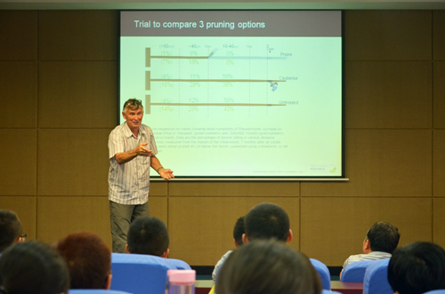 报告会上, Allan Ross Ferguson院士向大家介绍了猕猴桃的生物学特性和人工栽培历史,介绍了新西兰的猕猴桃发展现状,强调了猕猴桃种质资源对于猕猴桃育种的重要性,指出了当今猕猴桃品种种植比较单一,仅“海沃德”品种就占据了全世界70%的种植面积,因此我们还需要大力开展其它品种的选育和推广;Mike Manning博士向大家展示了一种细菌病害“PSA”在全世界的发展以及对新西兰猕猴桃种植的影响,介绍了目前对这种细菌病害的相关研究及相应的应对措施;Jinhu Wu 博士向大家回顾了试管离体生物技术如胚挽救技术、原生质体融合等在果树育种工作中的重要作用,指出了相对于转基因技术,这种技术在安全性和育种实际工作中的优势。