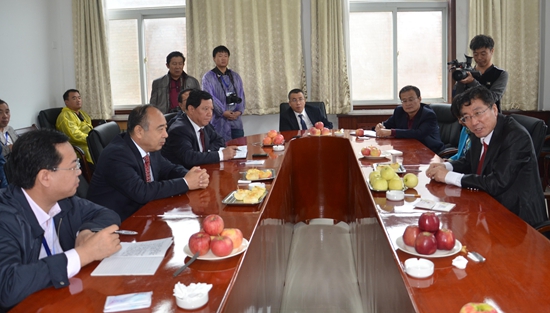 开幕式前,孙其信董事长参观了公司专家参与指导的洛川苹果标准化示范园。开幕式后,孙董事长在延安市市长梁宏贤、副市长杨霄、省科技厅副厅长许春霞、省果业局局长高武斌、洛川县委书记彭安季及相关部门领导陪同下视察了公司延安洛川苹果试验站。试验站首席专家马锋旺教授和站长安贵阳研究员汇报了试验站建站以来在苹果品种和砧木选育、特色资源收集保存、旱地肥水高效利用、苹果重茬建园等方面的试验示范进展及开展科技服务情况。孙其信董事长对试验站针对陕北苹果产业存在的技术需求所开展的技术研发工作给予了高度肯定,并会同延安市、洛川县及省主管部门负责人就试验站基础设施建设及今后研发的重点进行了研讨。